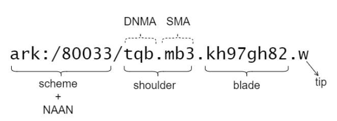 The ark:/, designates the schema of the identifiers. The 80033 is the NAAM responsible for the identifier. The shoulder (in Figure 1 the shoulder is tqbmb3) designates the organization unit (e.g., university department) responsible for the identifier, defining sub-namespace. Unique shoulders guarantee that names within the sub-namespace will also be unique outside of it, and the unit need only focus on creating the rest of the key in a unique way. The blade (kh97gh8) is a unique id generated by the unit. Finally, the tip (w) is the verification digit of all parts of the ARK identifier.